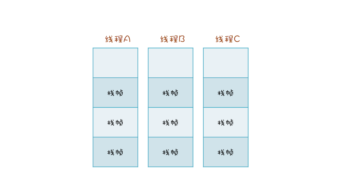 例如,有三个方法A、B、C,他们的调用关系是A->B->C(A调用B,B调用C),在运行时,会构建出下面这样的调用栈。每个方法在调用栈里都有自己的独立空间,称为栈帧,每个栈帧里都有对应方法需要的参数和返回地址。当调用方法时,会创建新的栈帧,并压入调用栈;当方法返回时,对应的栈帧就会被自动弹出。也就是说,栈帧和方法是同生共死的。