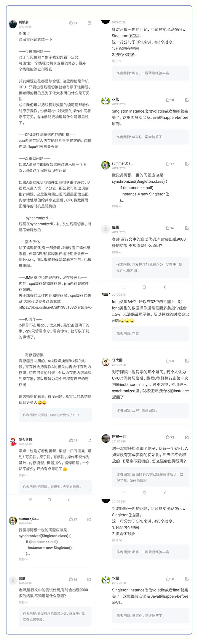 所以,留言区也是一个宝藏之地,有些同学的回答甚至可能比老师举的例子更加让人印象深刻,例如《01 | 可见性、原子性和有序性问题:并发编程Bug的源头》下的留言,两个字,精彩!当初读完第一章的时候我就暗下决心,绝不能输给这些同学。