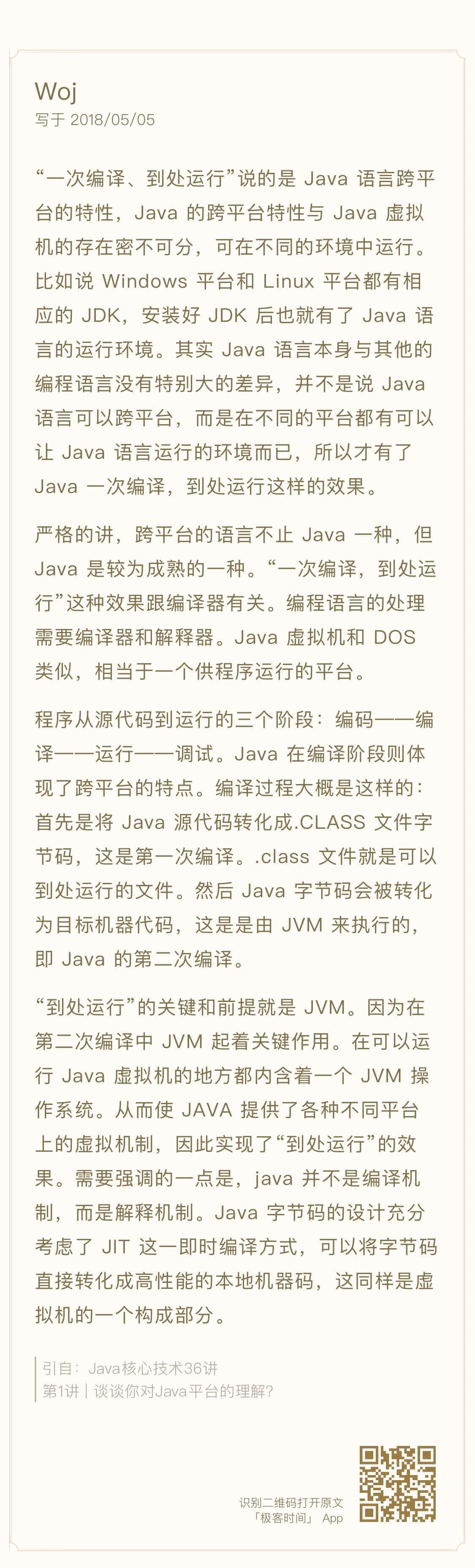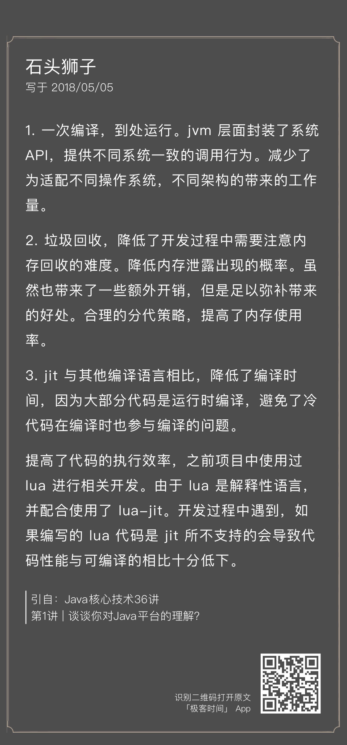 你好,我是杨晓峰。今天是周末,我们稍微放松一下来聊聊“Java核心技术”之外的内容,正好也借这个机会,兑现一下送出学习奖励礼券的承诺。我在每一讲后面都留下了一道思考题,希望你通过学习,结合自身工作实际,能够认真思考一下这些问题,一方面起到检验学习效果的作用,另一方面可以查漏补缺,思考一下这些平时容易被忽略的面试考察点。我并没有给出这些思考题的答案,希望你通过专栏学习或者查阅其他资料进行独立思考,将自己思考的答案写在留言区与我和其他同学一起交流,这也是提升自己重要的方法之一。