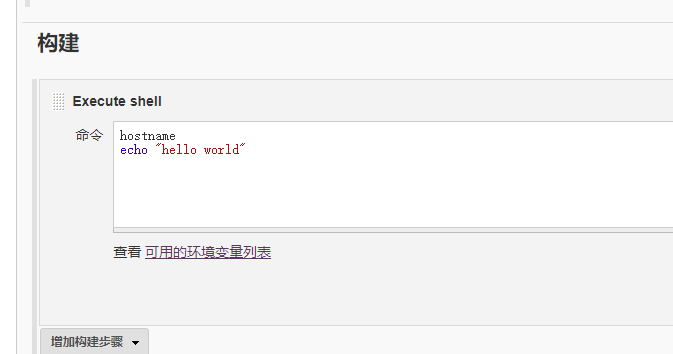 在“构建”步骤的”增加构建步骤“选项框里选择Execute shell,该选项表示在目标主机上执行shell命令。需要注意的是,如果在”General“步骤没有对项目的运行节点进行特殊配置,该任务运行的主机为Jenkins master节点,也就是在jenkins master服务器上执行shell命令。