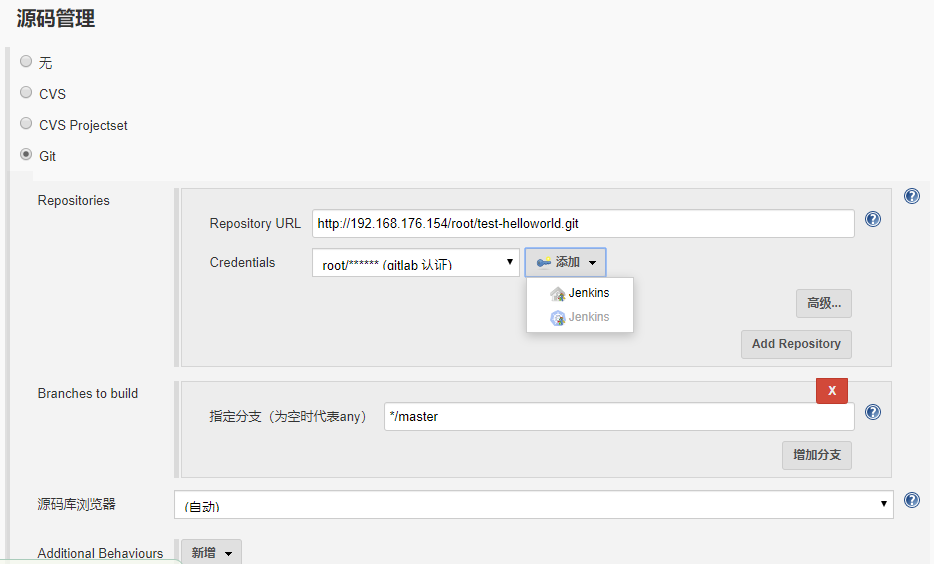 其中Credntials为创建的对Gitlab仓库认证的凭证,点击上图中的Jenkins选项,在跳转的界面中,在”类型“选项框选择Username with password,并在下面的输入框中输入用户名和密码以及用于区分该凭证的用户,输入好保存即可。然后就可以在Credntials参数的下拉框中看到刚刚创建的凭证了。有关Jenkins凭证的内容,会在下一章节详细介绍。