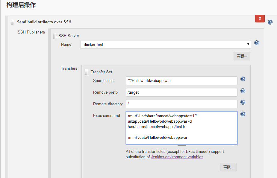 代码部署的方式与使用freestyle方式部署项目的方法相同,既可以使用publish over ssh插件也可以使用Exec shell方式。只不过在maven项目中,使用Publish over SSH插件的参数选项名称变为Send files execute commands over ssh,但是配置参数没有变。