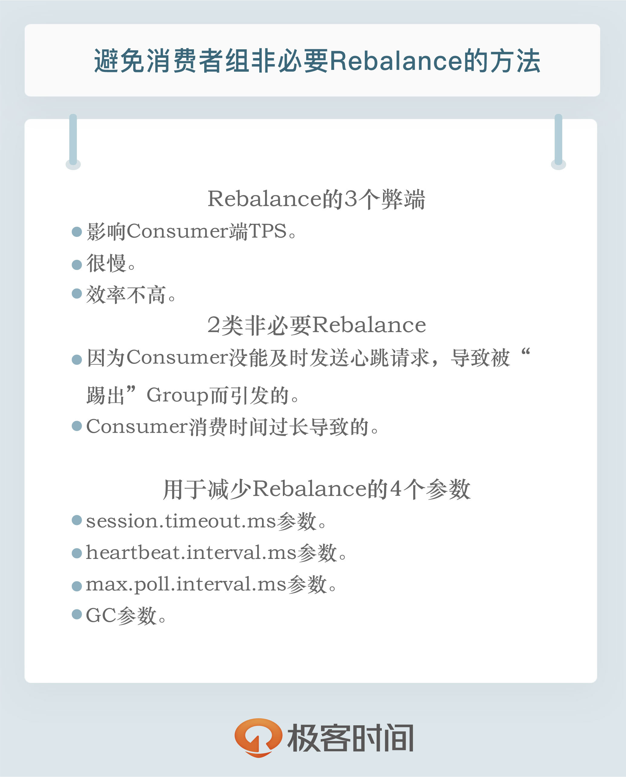 第二类非必要Rebalance是Consumer消费时间过长导致的。我之前有一个客户,在他们的场景中,Consumer消费数据时需要将消息处理之后写入到MongoDB。显然,这是一个很重的消费逻辑。MongoDB的一丁点不稳定都会导致Consumer程序消费时长的增加。此时,max.poll.interval.ms参数值的设置显得尤为关键。如果要避免非预期的Rebalance,你最好将该参数值设置得大一点,比你的下游最大处理时间稍长一点。就拿MongoDB这个例子来说,如果写MongoDB的最长时间是7分钟,那么你可以将该参数设置为8分钟左右。