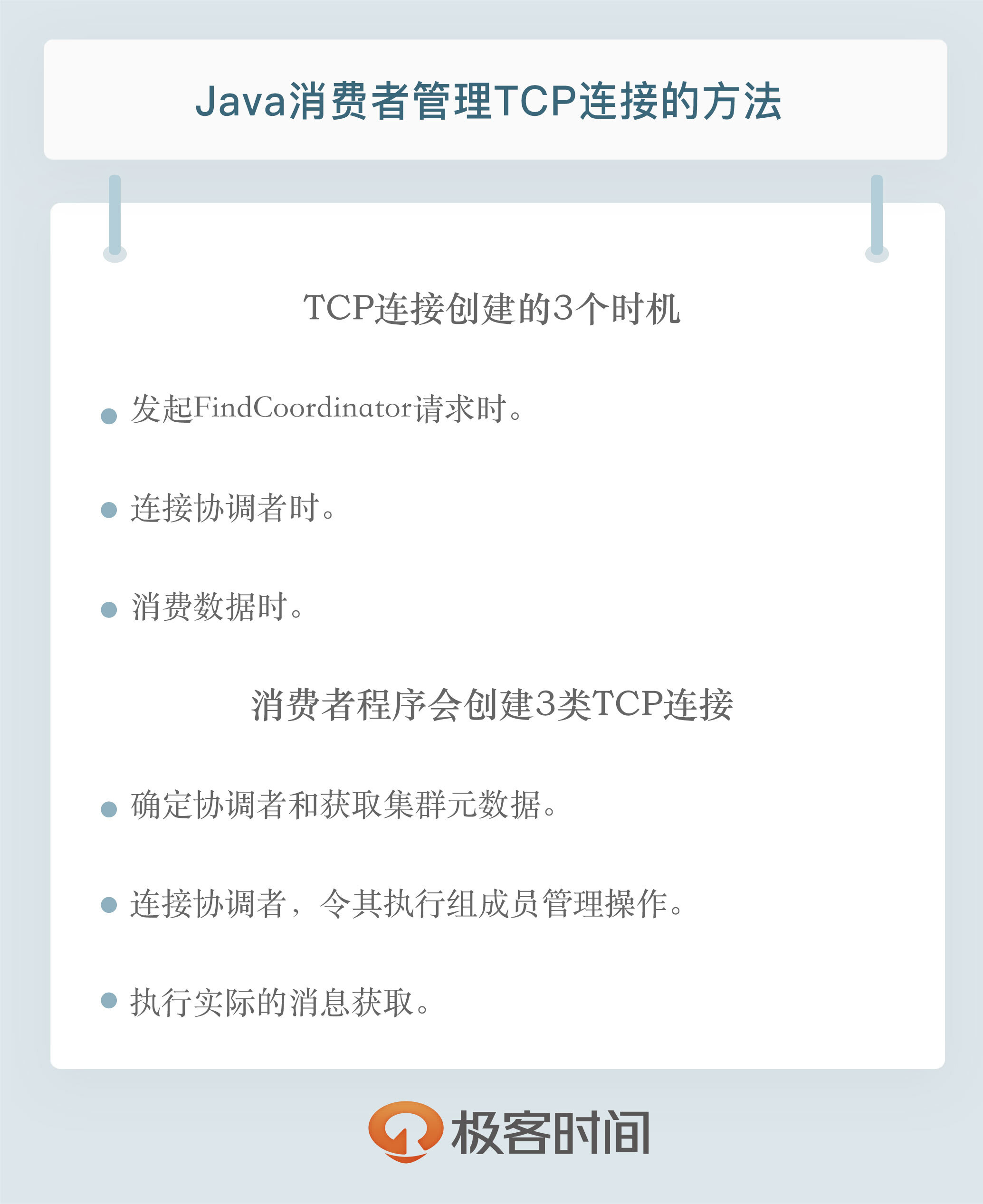 下面我们来说说消费者创建TCP连接的数量。你可以先思考一下大致需要的连接数量,然后我们结合具体的Kafka日志,来验证下结果是否和你想的一致。