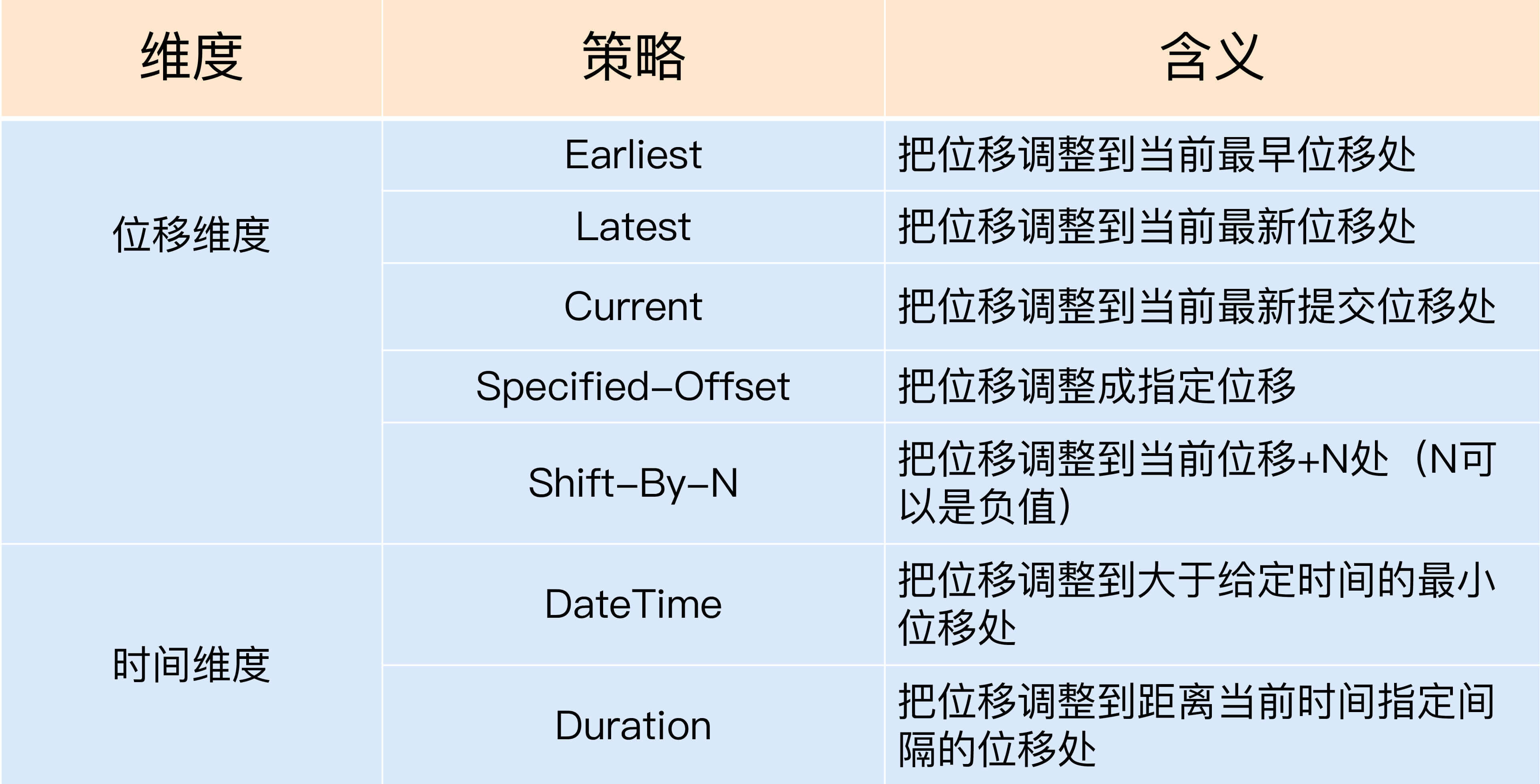 Duration策略则是指给定相对的时间间隔,然后将位移调整到距离当前给定时间间隔的位移处,具体格式是PnDTnHnMnS。如果你熟悉Java 8引入的Duration类的话,你应该不会对这个格式感到陌生。它就是一个符合ISO-8601规范的Duration格式,以字母P开头,后面由4部分组成,即D、H、M和S,分别表示天、小时、分钟和秒。举个例子,如果你想将位移调回到15分钟前,那么你就可以指定PT0H15M0S。