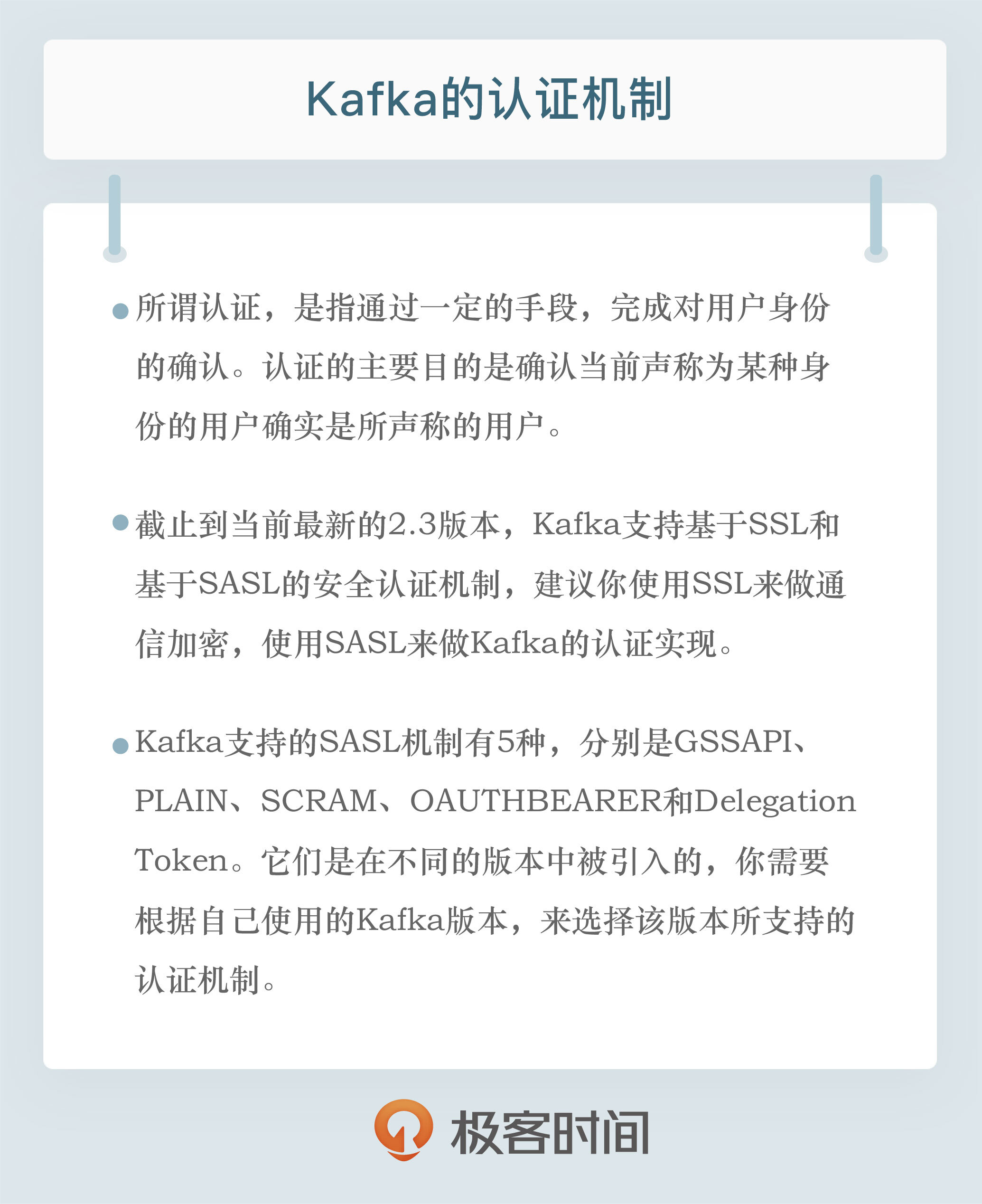 好了,我们来小结一下。今天,我们讨论了Kafka目前提供的几种认证机制,我给出了它们各自的优劣势以及推荐使用建议。其实,在真实的使用场景中,认证和授权往往是结合在一起使用的。在专栏下一讲中,我会详细向你介绍Kafka的授权机制,即ACL机制,敬请期待。