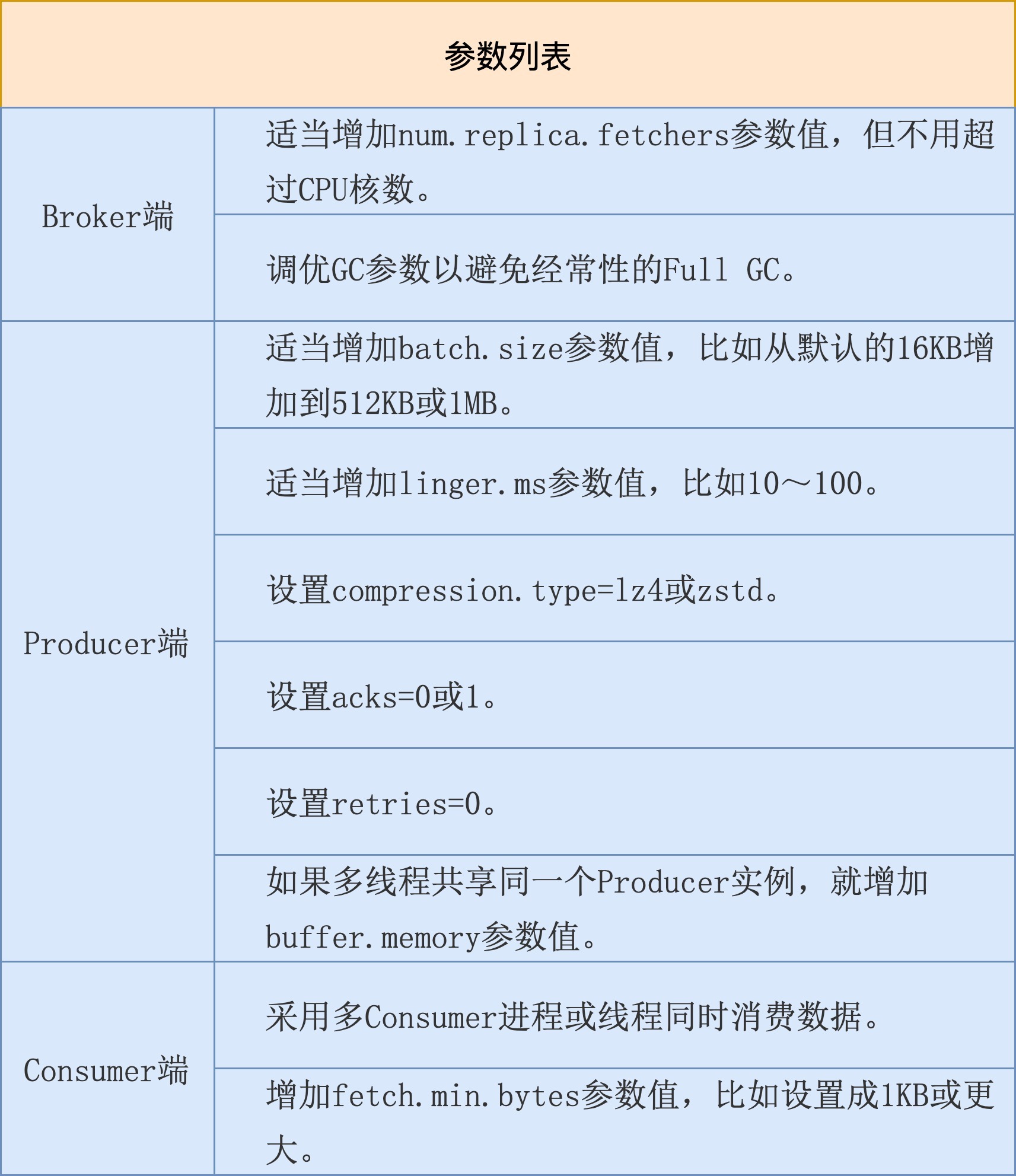 在Producer端,我们希望消息尽快地被发送出去,因此不要有过多停留,所以必须设置linger.ms=0,同时不要启用压缩。因为压缩操作本身要消耗CPU时间,会增加消息发送的延时。另外,最好不要设置acks=all。我们刚刚在前面说过,Follower副本同步往往是降低Producer端吞吐量和增加延时的首要原因。