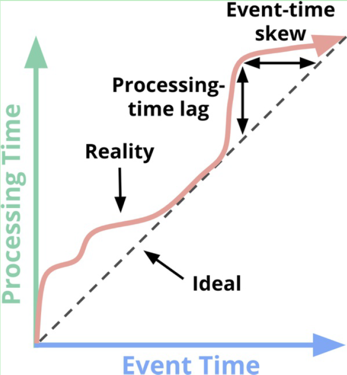 该图中的45°虚线刻画的是理想状态,即Event Time等于Processing Time,而粉色的曲线表征的是真实情况,即Processing Time落后于Event Time,而且落后的程度(Lag)不断变化,毫无规律。