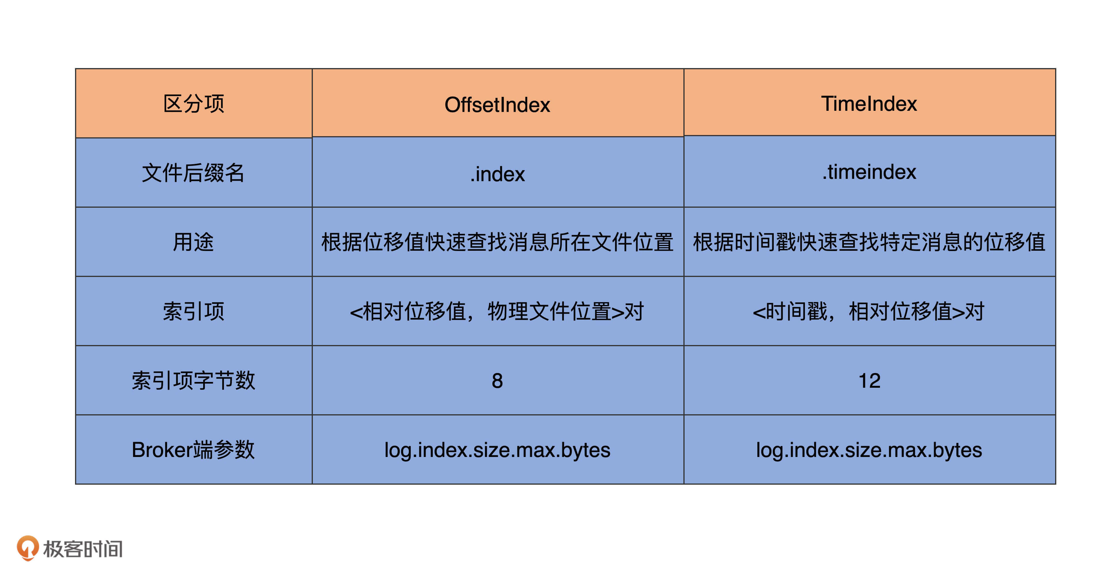 讲到这里,这节课就接近尾声了。最后,我用一张表格汇总下OffsetIndex和TimeIndex的特点和区别,希望能够帮助你更好地理解和消化今天的重点内容。