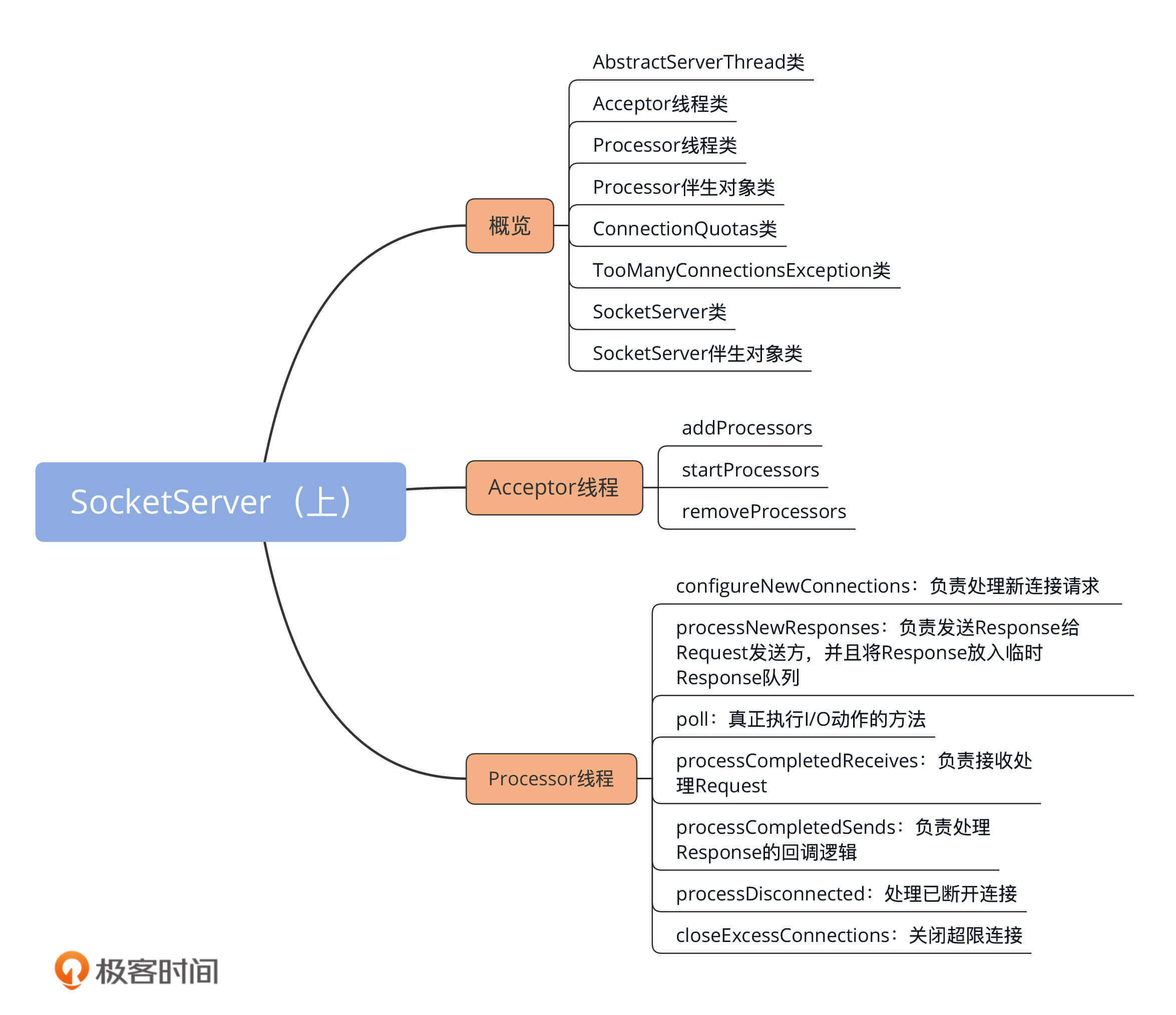 今天,我带你了解了Kafka网络通信层的全貌,大致介绍了核心组件SocketServer,还花了相当多的时间研究SocketServer下的Acceptor和Processor线程代码。我们来简单总结一下。