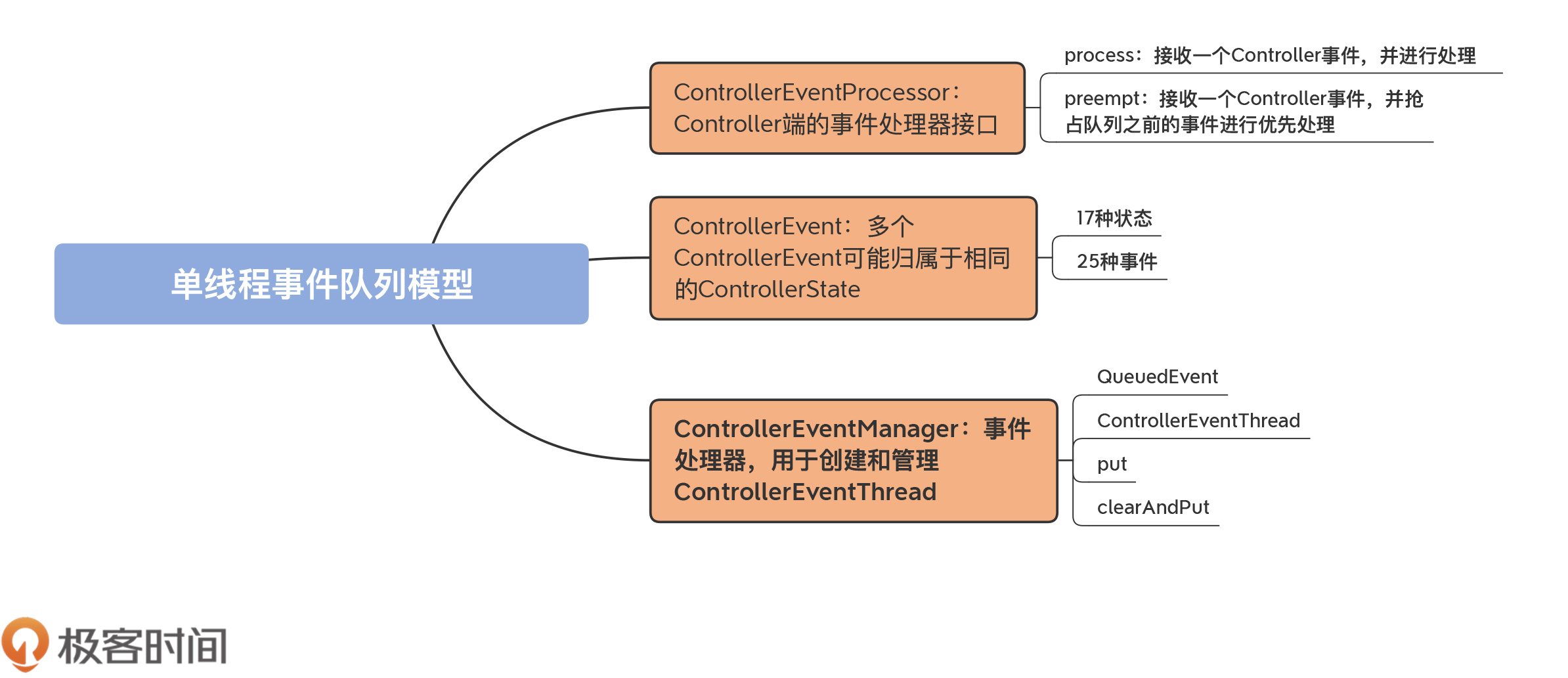 所谓的单线程事件处理器,就是Controller端定义的一个组件。该组件内置了一个专属线程,负责处理其他线程发送过来的Controller事件。另外,它还定义了一些管理方法,用于为专属线程输送待处理事件。
