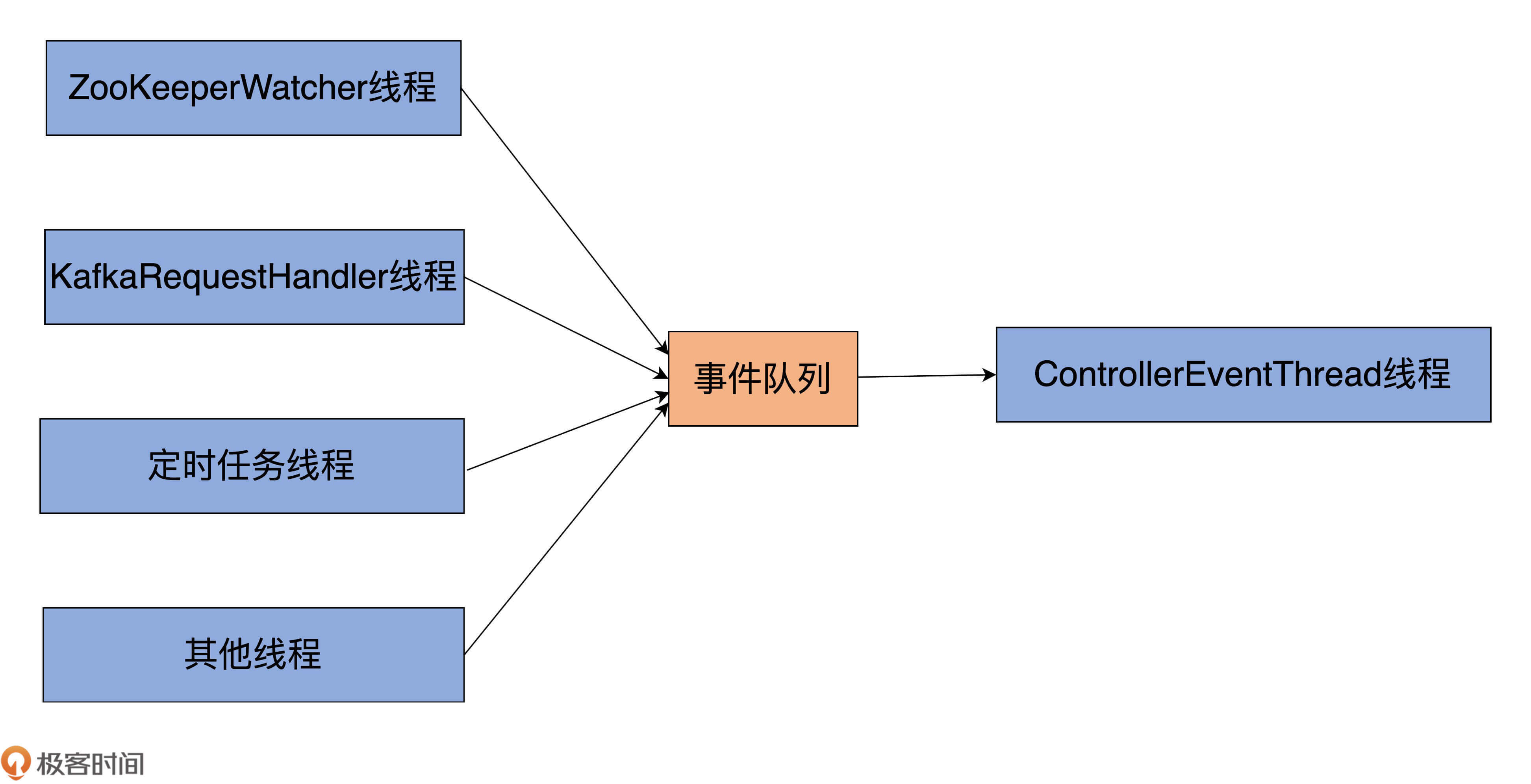 从图中可见,Controller端有多个线程向事件队列写入不同种类的事件,比如,ZooKeeper端注册的Watcher线程、KafkaRequestHandler线程、Kafka定时任务线程,等等。而在事件队列的另一端,只有一个名为ControllerEventThread的线程专门负责“消费”或处理队列中的事件。这就是所谓的单线程事件队列模型。