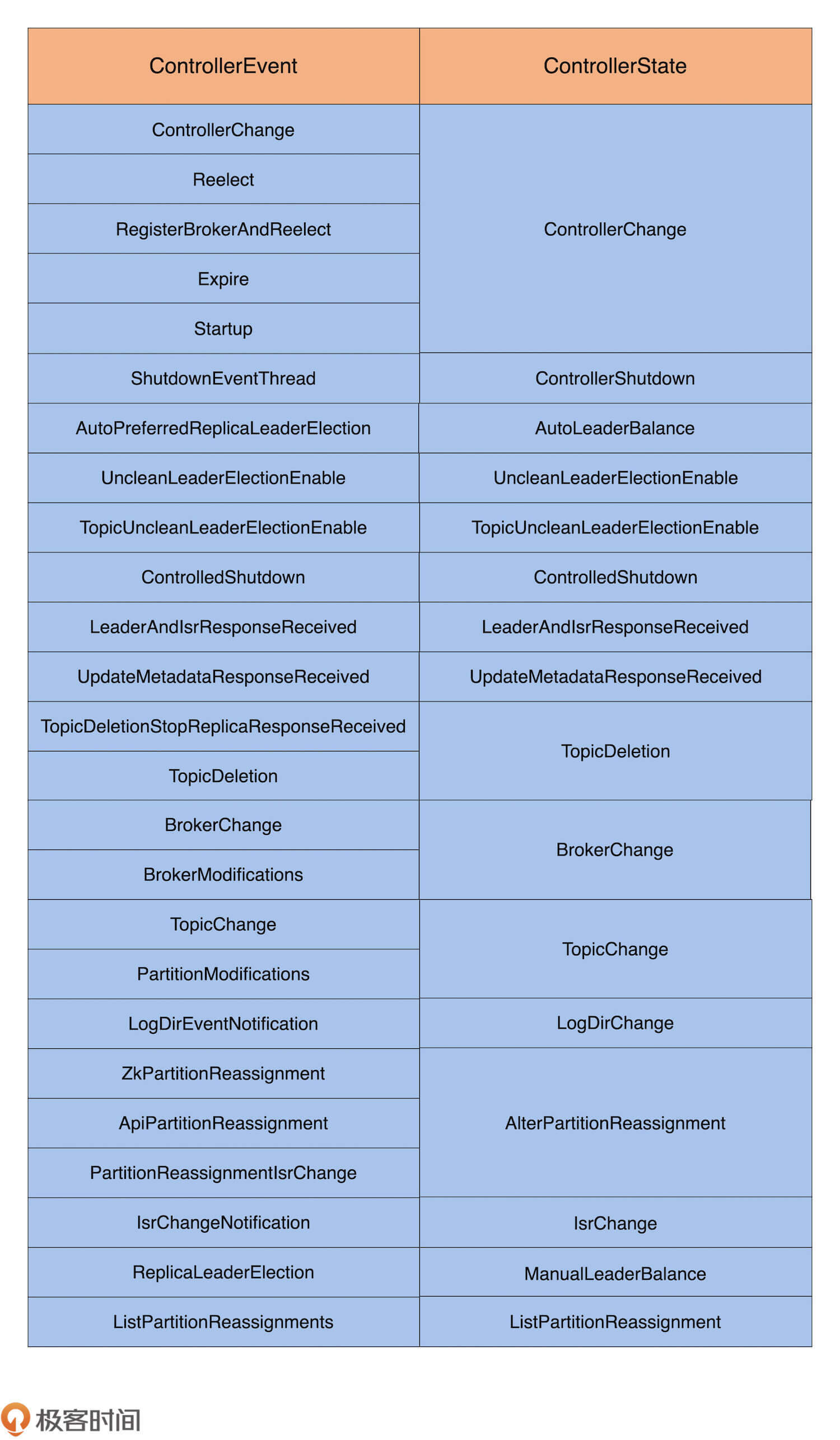 • ControllerState:定义Controller状态。你可以认为,它是ControllerEvent的上一级分类,因此,ControllerEvent和ControllerState是多对一的关系。