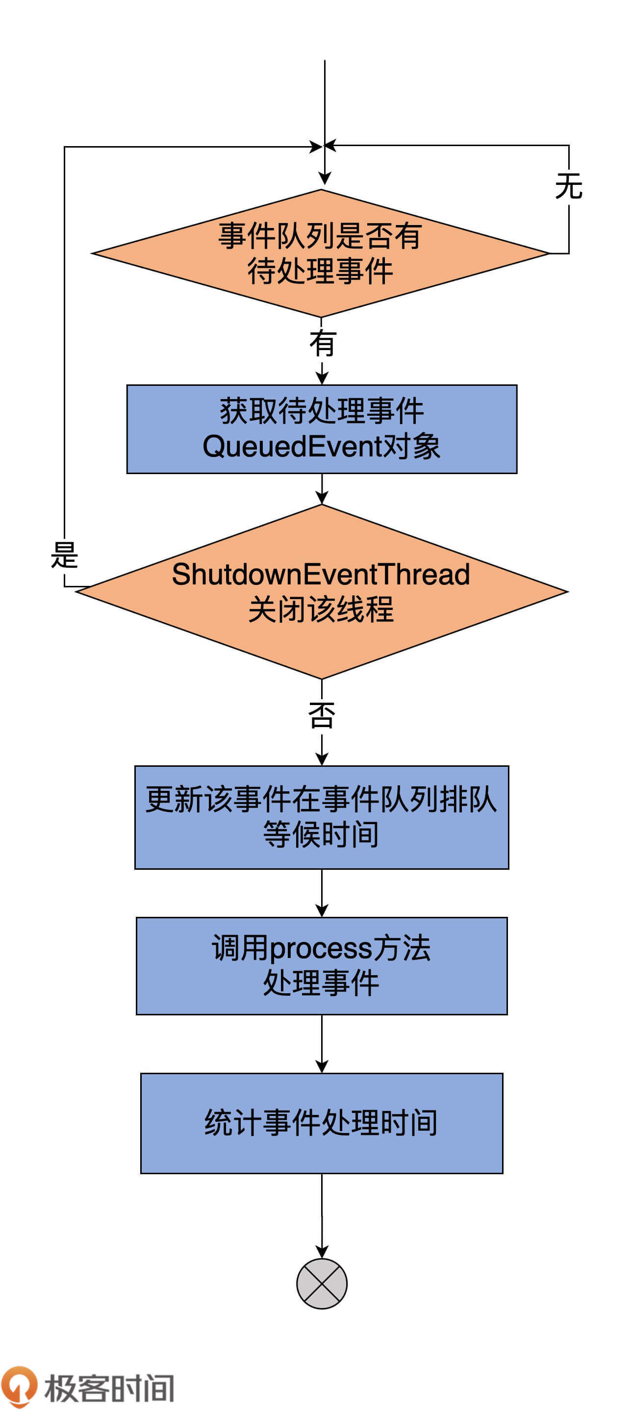 ControllerEventManager对象仅仅定义了3个公共变量,没有任何逻辑,你简单看下就行。至于ControllerEventProcessor接口,我们刚刚已经学习过了。接下来,我们重点学习后面这两个类。