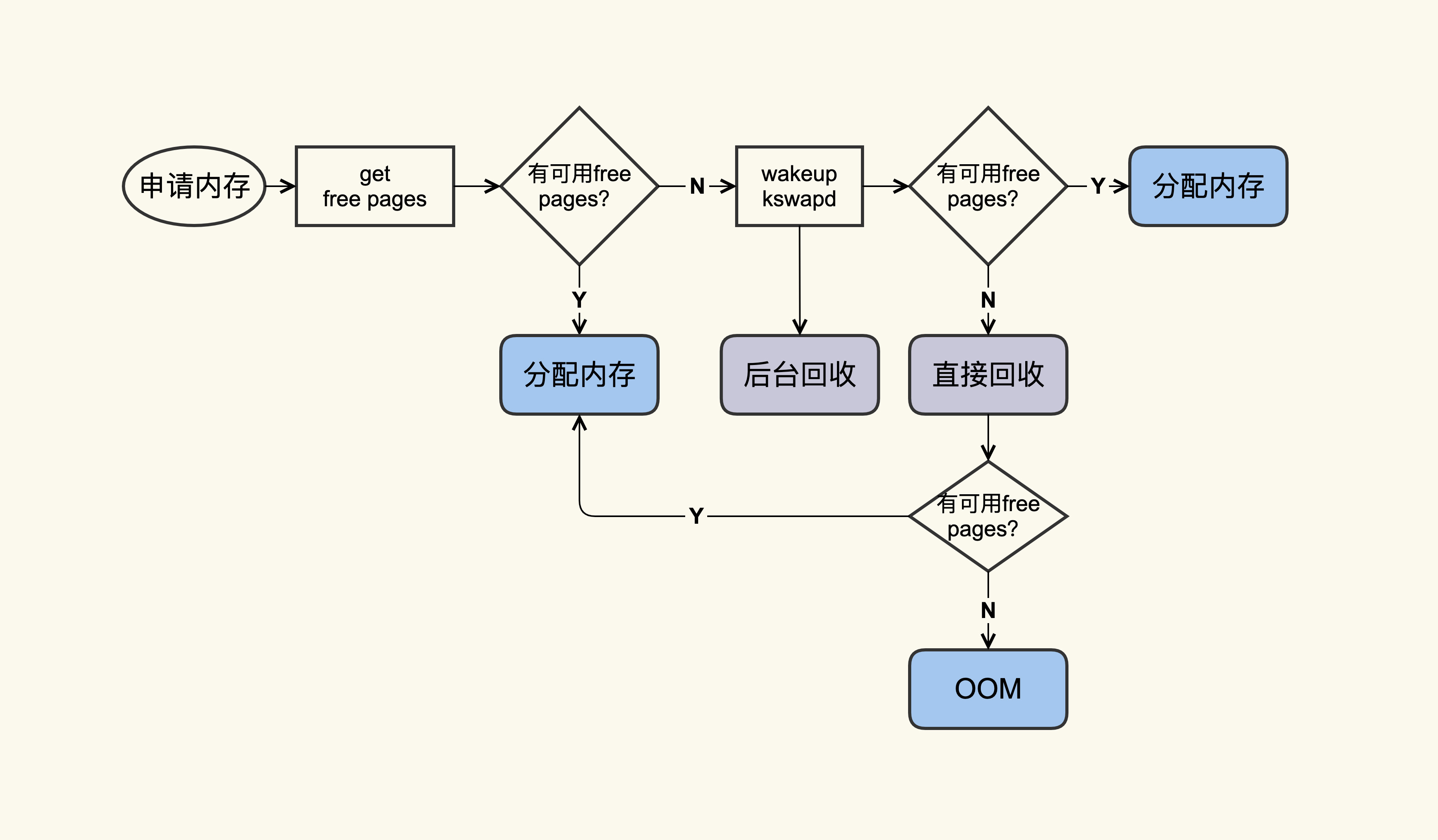 你可以看到,应用在申请内存的时候,即使没有free内存,只要还有足够可回收的Page Cache,就可以通过回收Page Cache的方式来申请到内存,回收的方式主要是两种:直接回收和后台回收。