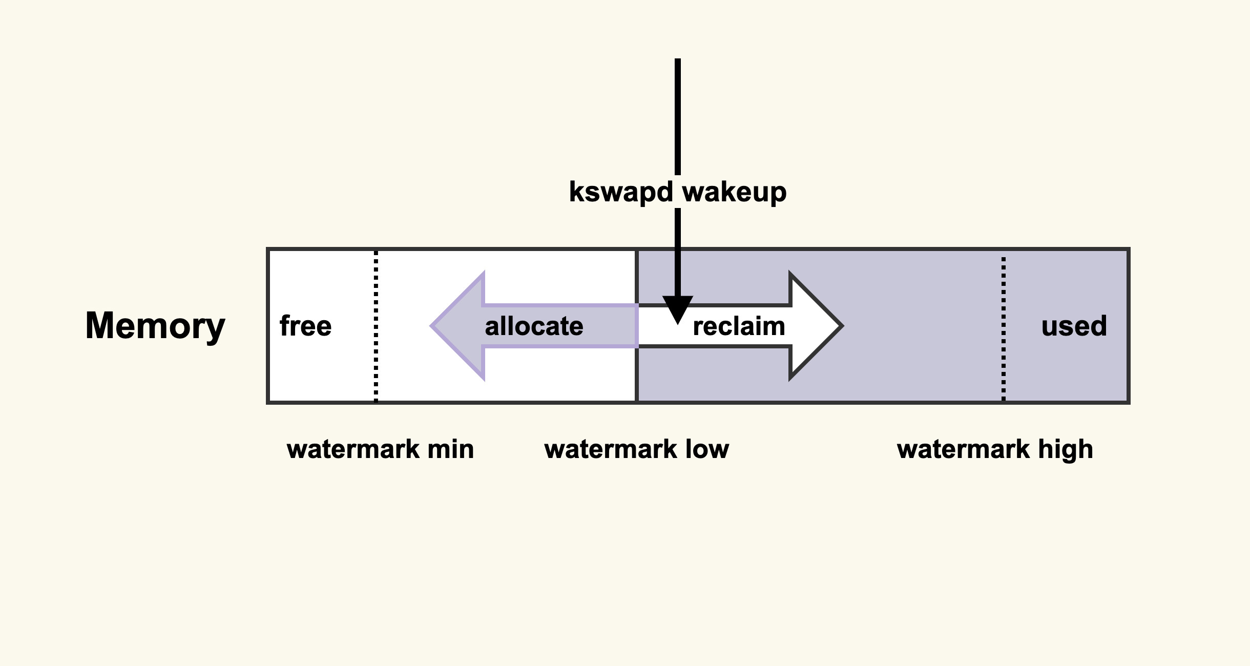它的意思是:当内存水位低于watermark low时,就会唤醒kswapd进行后台回收,然后kswapd会一直回收到watermark high。