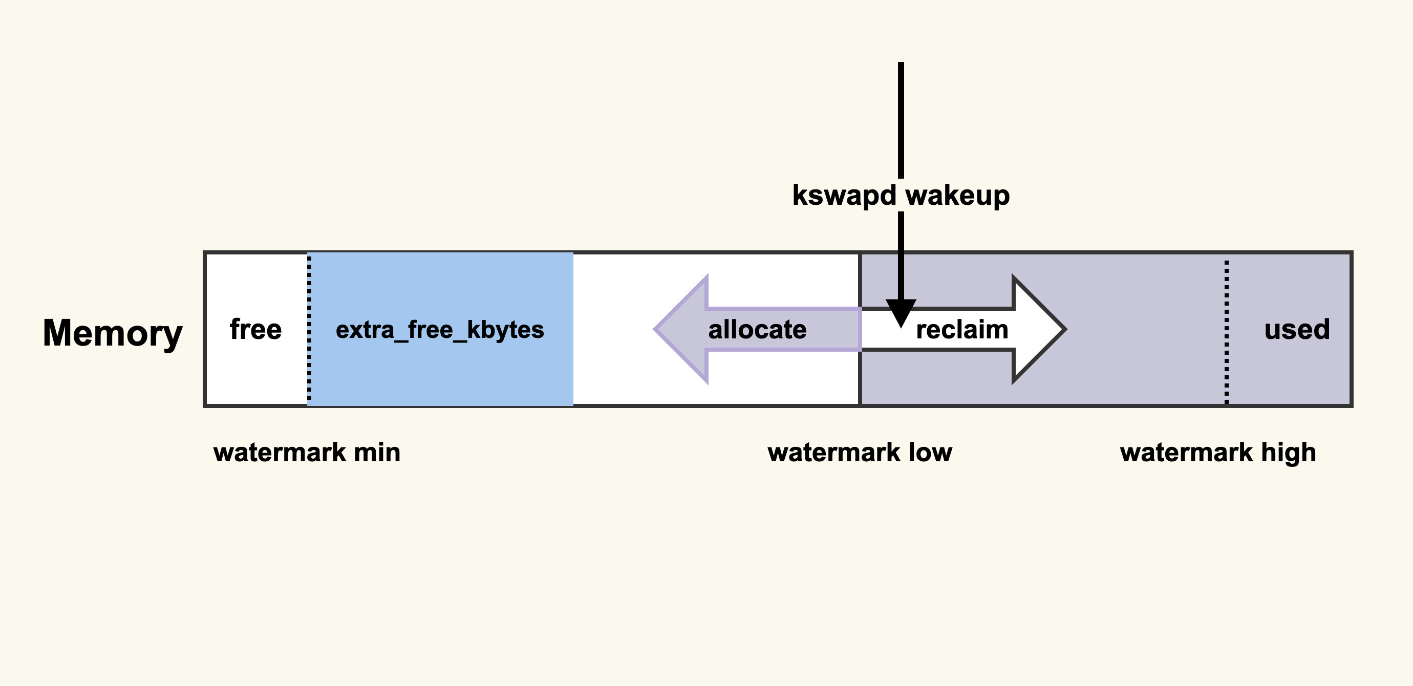 那就是将extra_free_kbytes 配置为4G。extra_free_kbytes在3.10以及以后的内核上都被废弃掉了,不过由于在生产环境中还存在大量的机器运行着较老版本内核,你使用到的也可能会是较老版本的内核,所以在这里还是有必要提一下。它的大致原理如下所示: