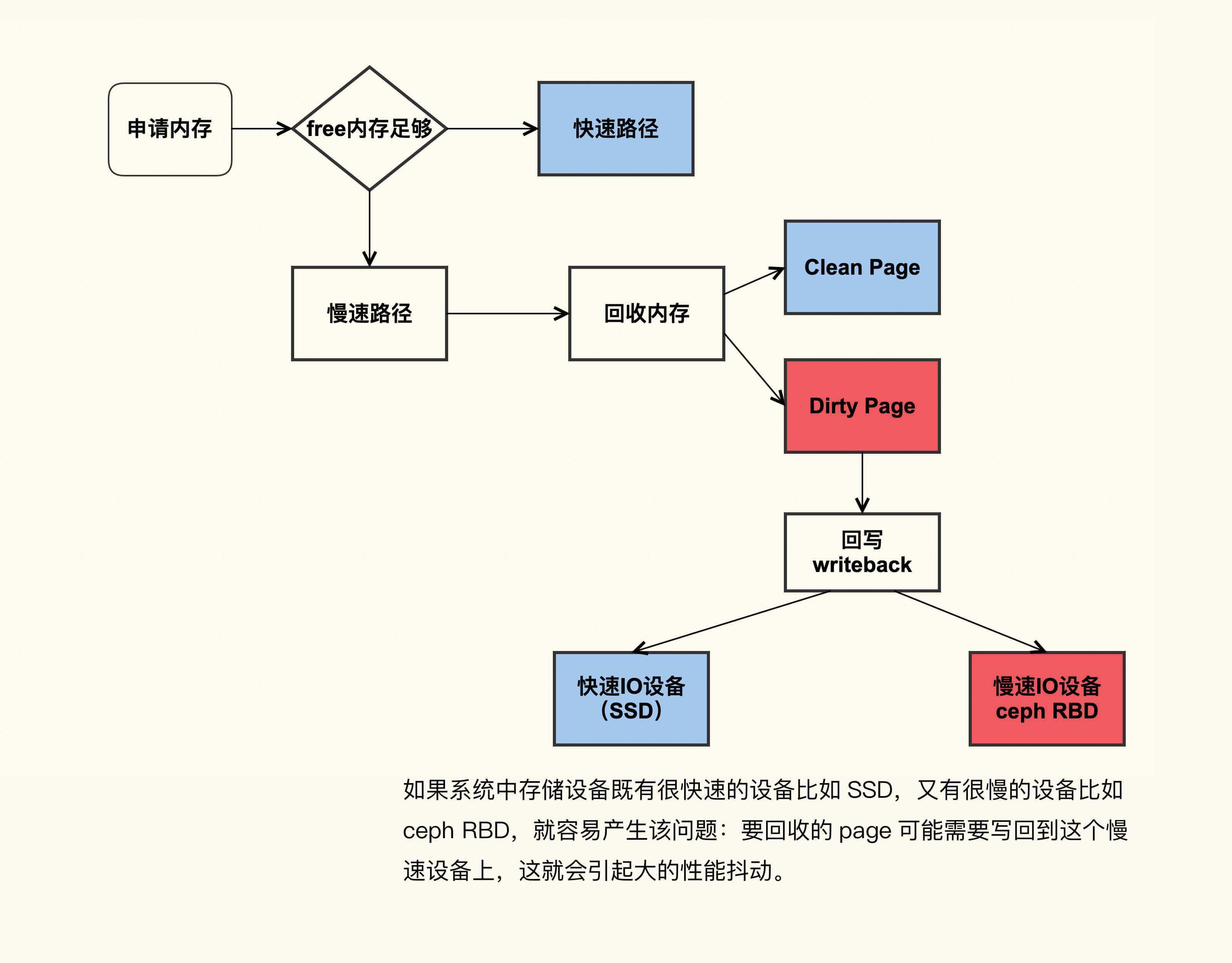 如图所示,如果系统中既有快速I/O设备,又有慢速I/O设备(比如图中的ceph RBD设备,或者其他慢速存储设备比如HDD),直接内存回收过程中遇到了正在往慢速I/O设备回写的page,就可能导致非常大的延迟。