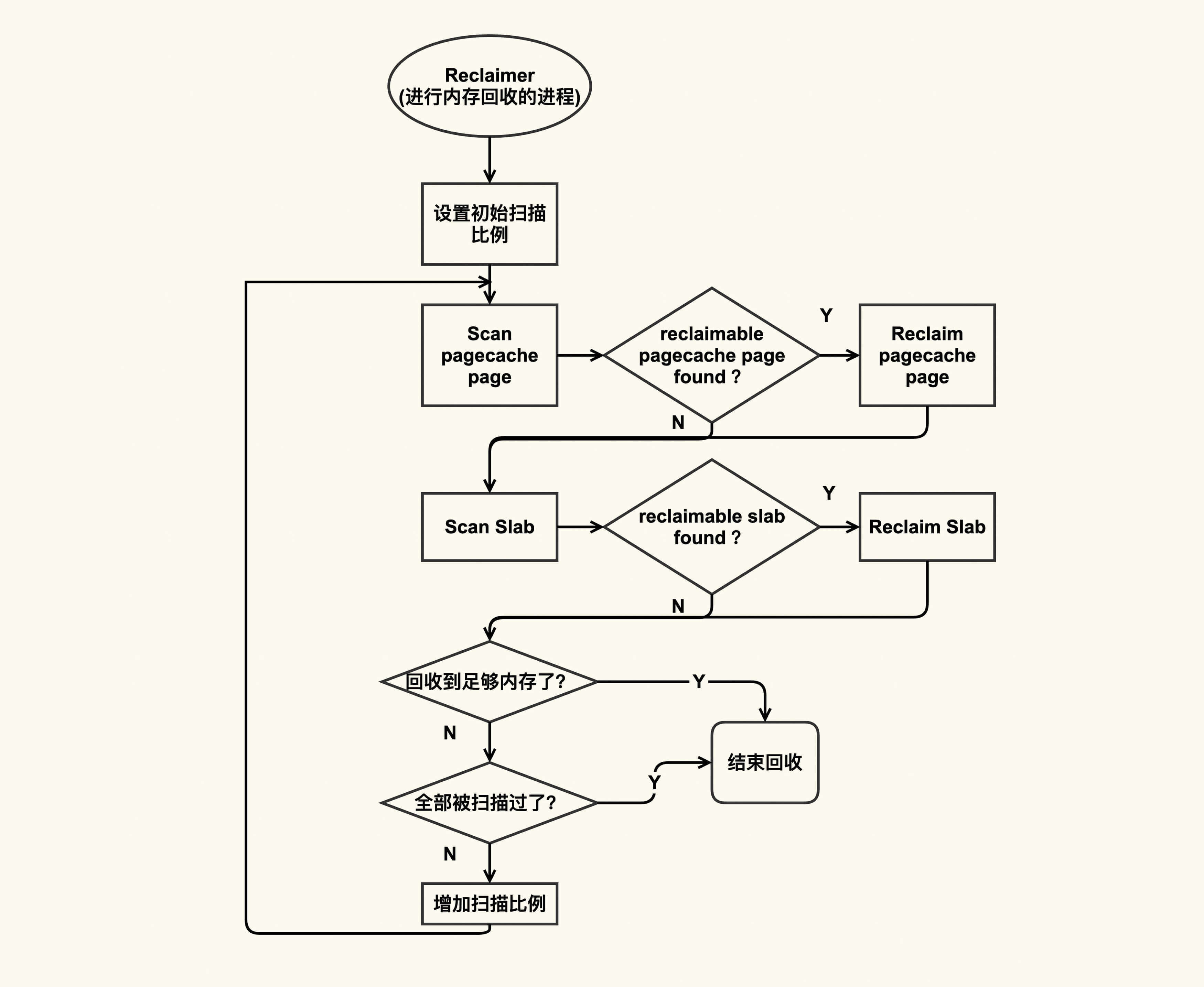 我们在前面已经提到过,在内存紧张的时候会触发内存回收,内存回收会尝试去回收reclaimable(可以被回收的)内存,这部分内存既包含Page Cache又包含reclaimable kernel memory(比如slab)。我们可以用下图来简单描述这个过程: