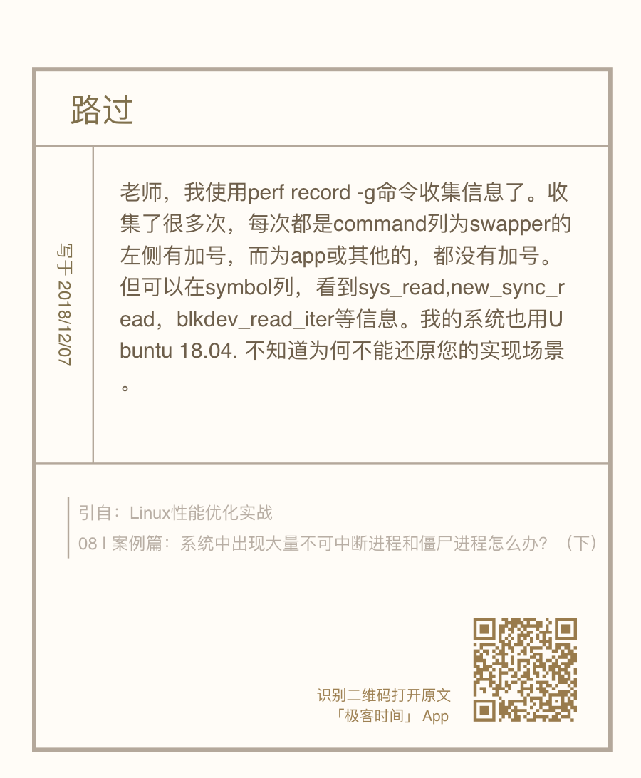 我很高兴看到留言有这么高的学习热情,其实好多文章后面都有大量留言,希望我能推荐书籍和学习资料。这一点也是我乐意看到的。专栏学习一定不是你性能优化之旅的全部,能够带你入门、帮你解决实际问题、甚至是激发你的学习热情,已经让我非常开心。