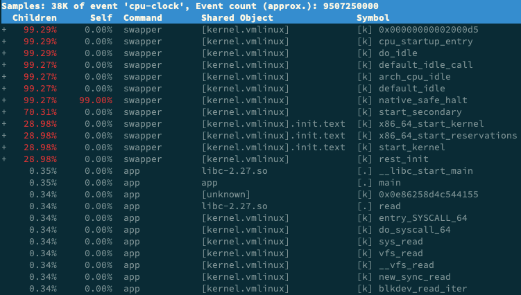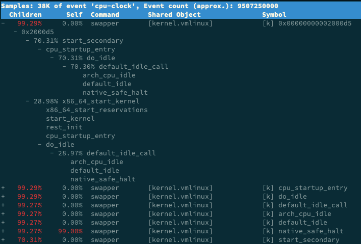 在问题4的perf report 界面中,你也一定注意到了, swapper 高达 99% 的比例。直觉来说,我们应该直接观察它才对,为什么没那么做呢?