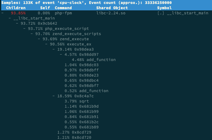 另外,php-fpm 镜像是基于 Debian 系统的,所以安装 perf 工具的命令,跟 Ubuntu 也并不完全一样。比如, Ubuntu 上的安装方法是下面这样: