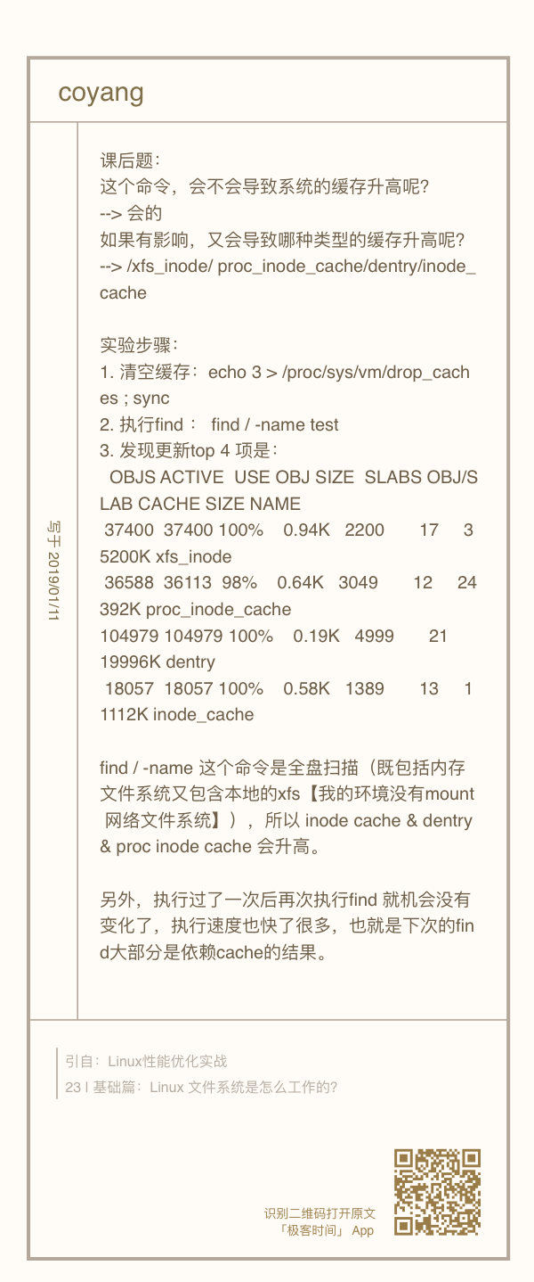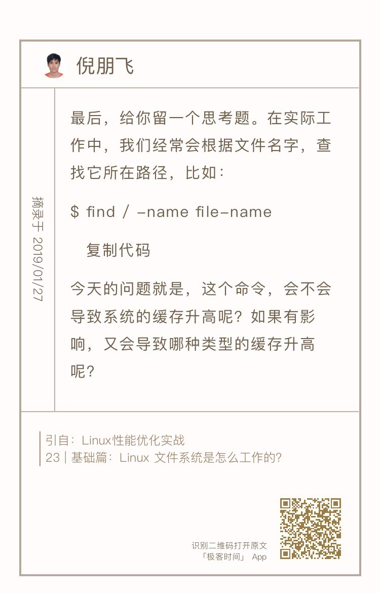 在文件系统原理文章的最后,我给你留了一道思考题,那就是执行 find 命令时,会不会导致系统的缓存升高呢?如果会导致,升高的又是哪种类型的缓存呢?