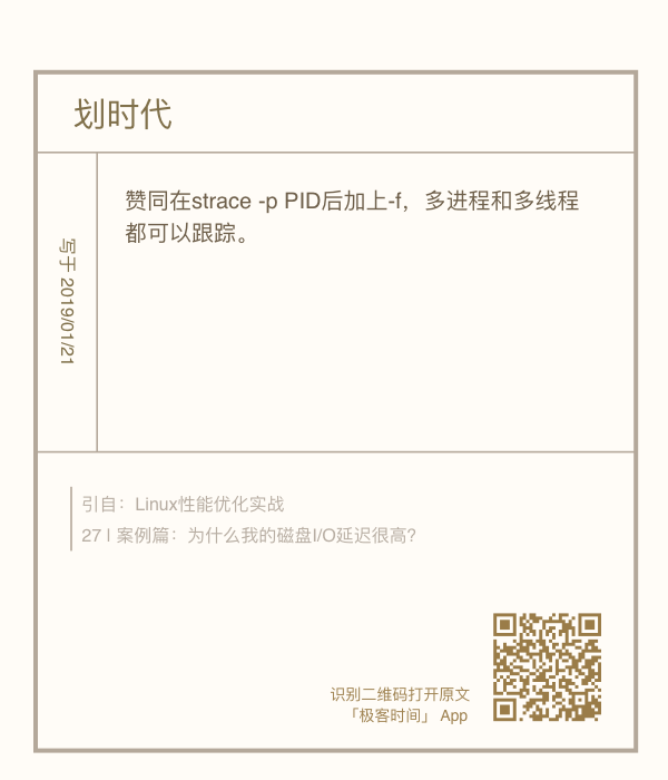 很多同学的留言都准确回答了这个问题。比如,划时代和 jeff 的留言都指出,在这个场景中,我们需要加 -f 选项,以便跟踪多进程和多线程的系统调用情况。