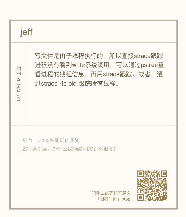 我们通过 iostat ,确认磁盘 I/O 已经出现了性能瓶颈,还用 pidstat 找出了大量磁盘 I/O 的进程。但是,随后使用 strace 跟踪这个进程,却找不到任何 write 系统调用。这是为什么呢?
