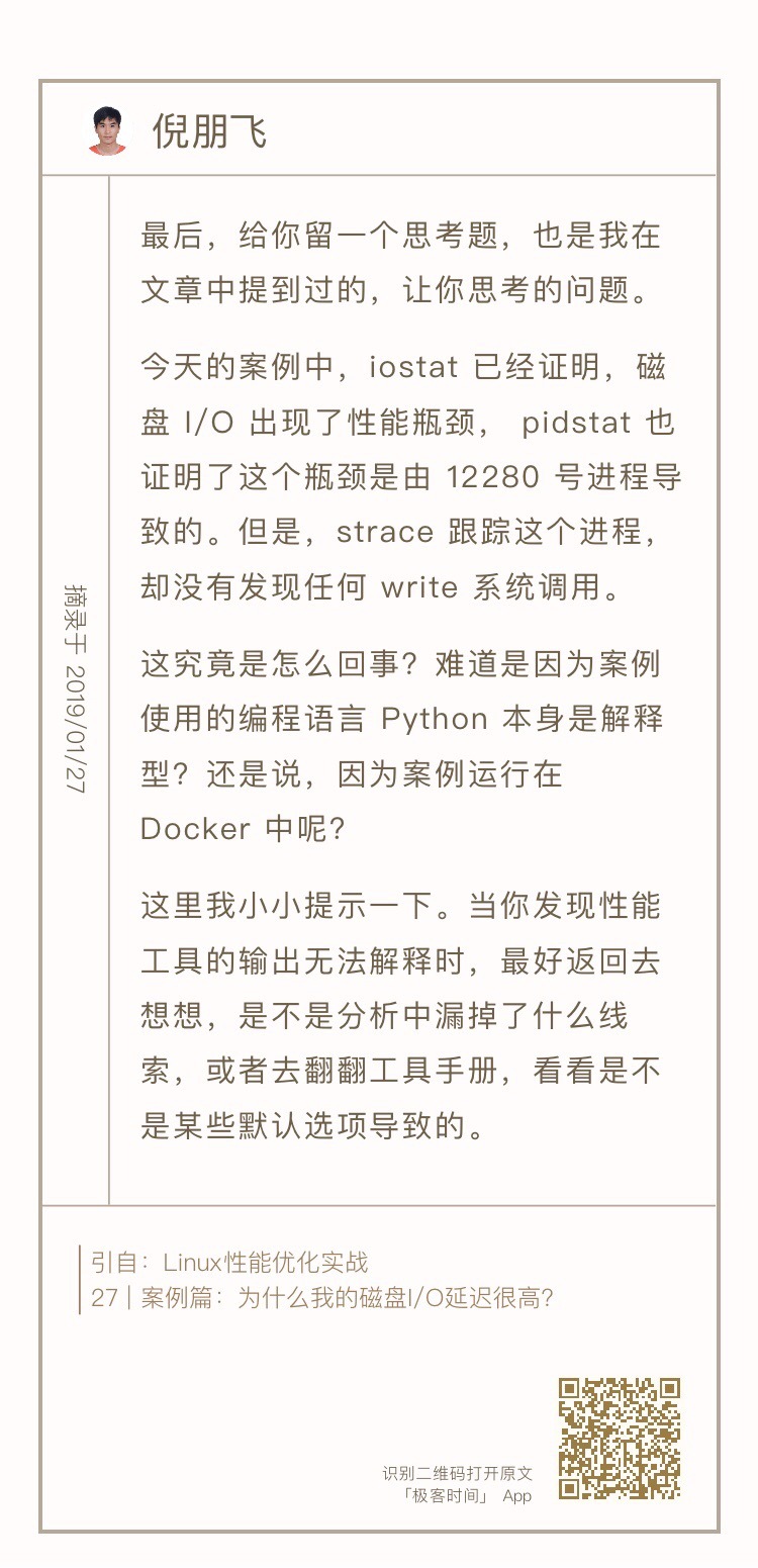 在磁盘 I/O 延迟案例的最后,我给你留了一道思考题。