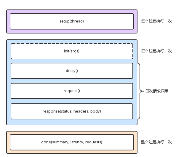 当然,wrk 最大的优势,是其内置的 LuaJIT,可以用来实现复杂场景的性能测试。wrk 在调用 Lua 脚本时,可以将 HTTP 请求分为三个阶段,即 setup、running、done,如下图所示: