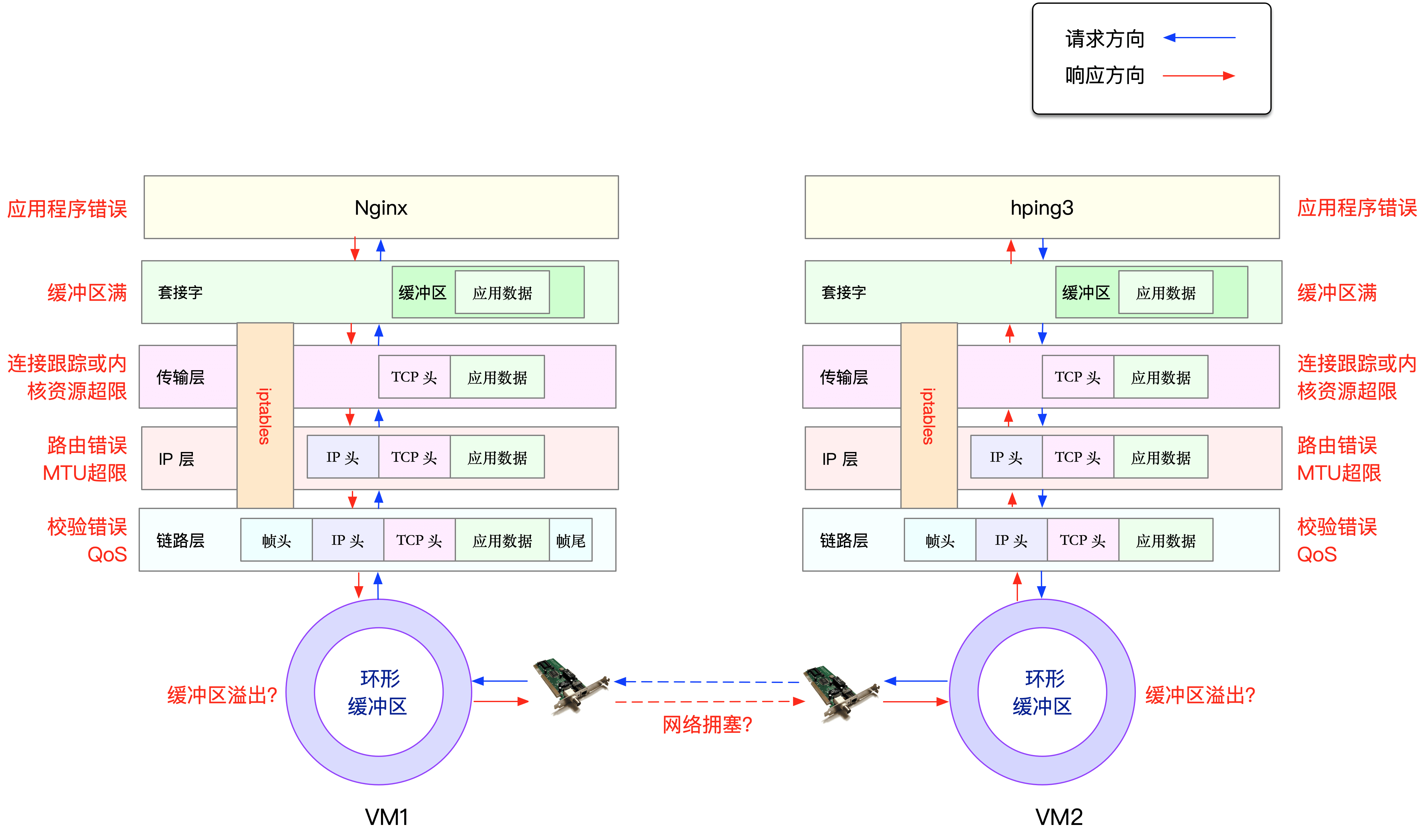 首先,来看最底下的链路层。当缓冲区溢出等原因导致网卡丢包时,Linux 会在网卡收发数据的统计信息中,记录下收发错误的次数。