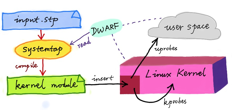 同 DTrace 一样,SystemTap 也定义了一种类似的脚本语言,方便用户根据需要自由扩展。不过,不同于 DTrace,SystemTap 并没有常驻内核的运行时,它需要先把脚本编译为内核模块,然后再插入到内核中执行。这也导致 SystemTap 启动比较缓慢,并且依赖于完整的调试符号表。