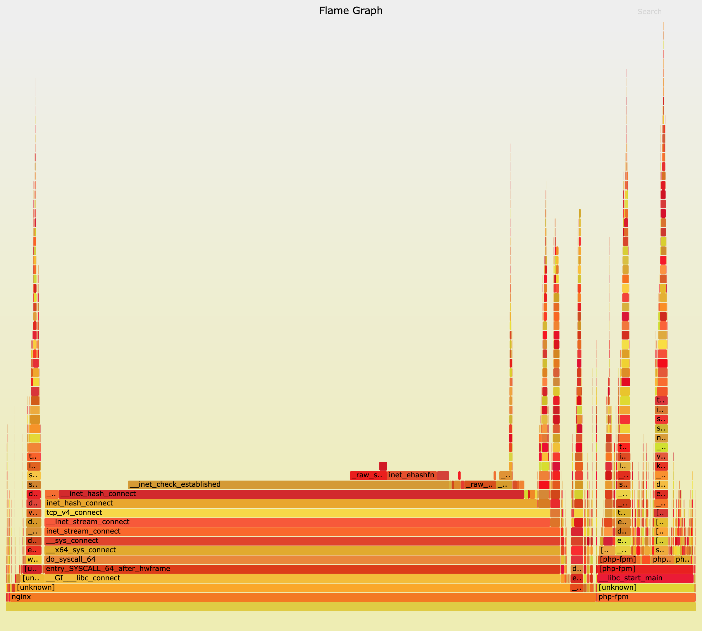 这儿中间的 do_syscall_64、tcp_v4_connect、inet_hash_connect 这个堆栈,很明显就是最需要关注的地方。inet_hash_connect() 是 Linux 内核中负责分配临时端口号的函数。所以,这个瓶颈应该还在临时端口的分配上。