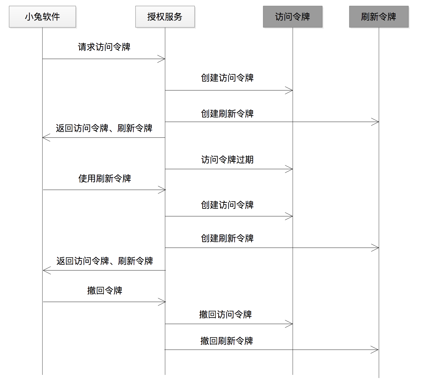 我将以上三种情况整理成了一份序列图,以便帮助你理解。同时,为了突出令牌,我将访问令牌和刷新令牌,特意用深颜色标识出来,并单独作为两个角色放进了整个序列图中。
