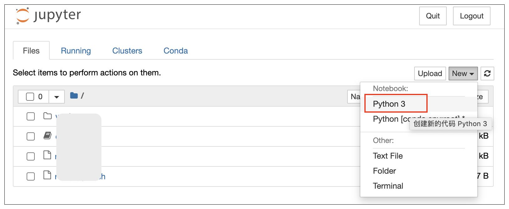 进入到 Jupyter Notebook 的界面,我们尝试新建一个Python的Notebook。具体操作方法如下图所示。点击“New”下拉菜单,然后点击“Python 3”选项,来创建一个新的Python Notebook。