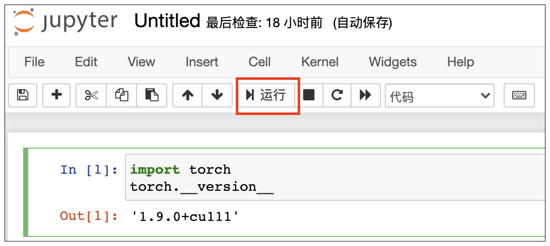 点击运行按钮,我们可以看到代码执行的结果,输出了当前安装的 PyTorch 的版本,即PyTorch 1.9.0 的GPU版本。这说明 PyTorch 框架已经安装成功。