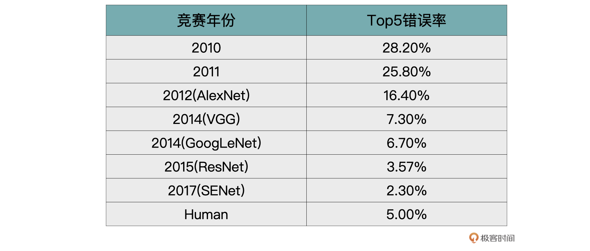 从2012年开始,伴随着深度学习的发展,几乎每一年都有非常经典的网络结构诞生,下表为历年来ImageNet上Top-5的错误率。