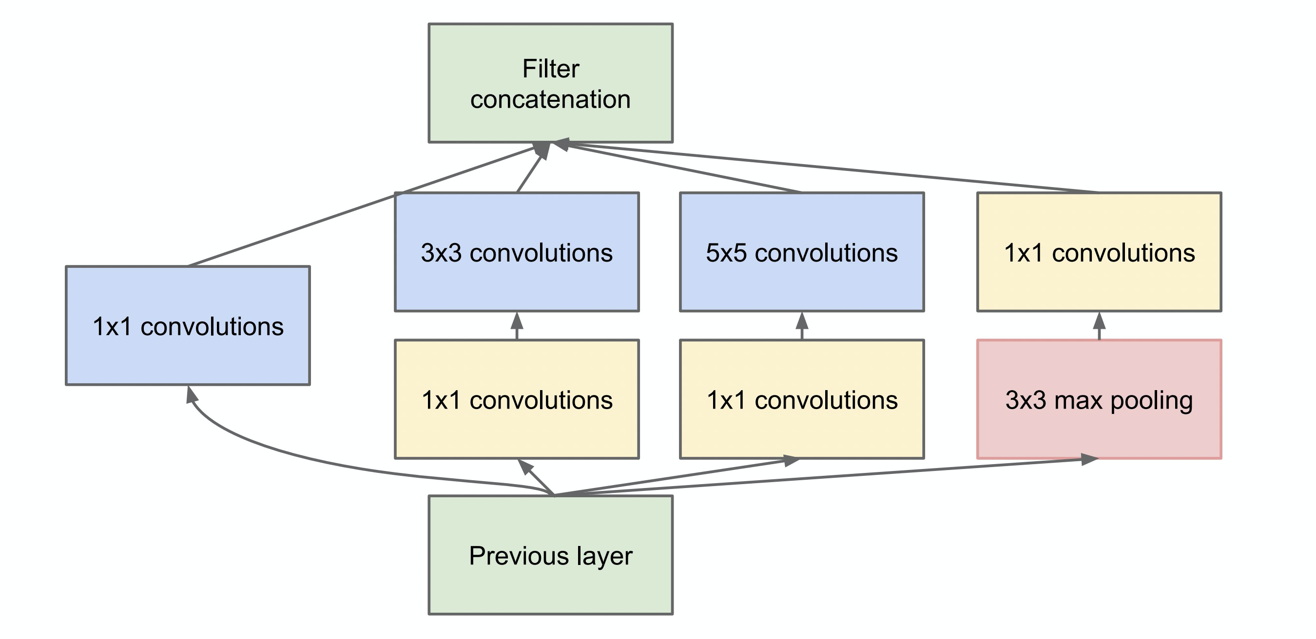作者为了降低网络的计算成本,将上述的Inception模块做了一步改进,在3x3、5x5之前与pooling之后添加了1x1卷积用来降维,从而获得了Inception模块的最终形态。