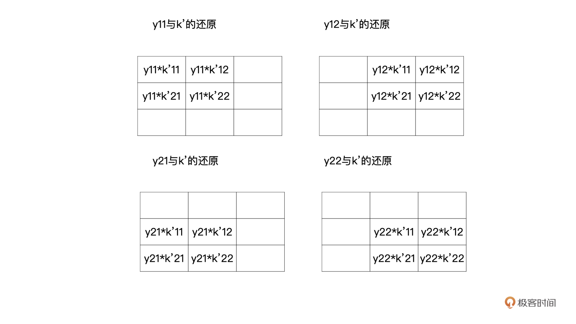 我们将转置卷积中的卷积核用k’表示,那么一个y会与四个k’进行还原,如下所示: