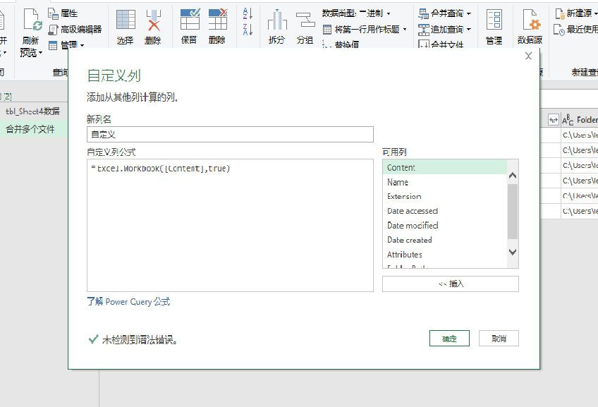 在这里,我们可以使用一个公式来添加新的列。你需要切换到“添加列”选项卡,单击“自定义列”按钮,然后在弹出的对话框中输入公式“Excel.Workbook([Content],true) ”, 最后点击确定。