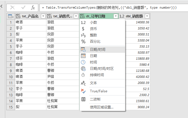 第六步,由于处理完数据内容后,Excel的每一列类型会自动变成文本类型,导致最终执行结果显示错误,所以我们还需要继续修改类型。可以看到,我把“订单日期”改为日期时间类型,把销售额改为小数类型。具体修改方式是点击列标题前的类型图标,通过弹出的下拉列表,选择指定的类型,如图所示: