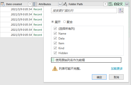 你需要点击第二步添加“自定义”列右侧的数据展开按钮,然后取消勾选“使用原始列名作为前缀”复选框,并点击确定。如图: