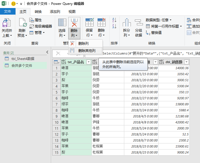 第五步,通过上面四个步骤,就可以把所有数据按照你需要的sheet、行、列,导入到Power Query编辑器了。不过这时编辑器界面还有要处理的中间数据,因此我可以通过删除其他列的方式,来删除额外的数据。