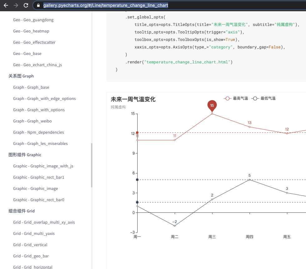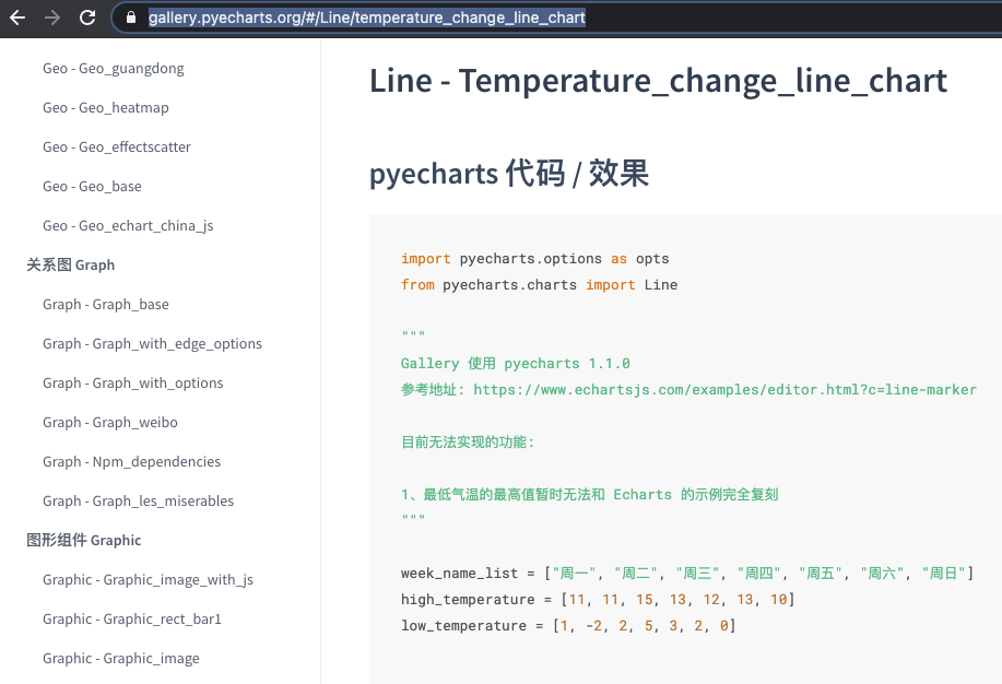 和我们学习seaborn类似,你可以参考图例,也可以参考分类来学习pyecharts支持的动态图表。与seaborn不同的是,pyecharts的官方文档没有图例,不过不要忘了,pyecharts是基于Echarts编写的,因此图例可以参考Echarts的官方网站。