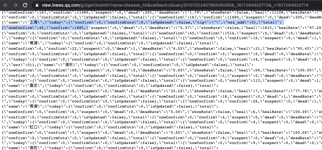 第四部,确认返回数据。当你从接口初步确认了该数据是“疫情实时数据”后,可以把该地址复制到浏览器中,进行访问。访问的具体办法就是通过模拟网页请求接口,这样就可以得到以下数据了。我将数据放在截图中,供你参考。