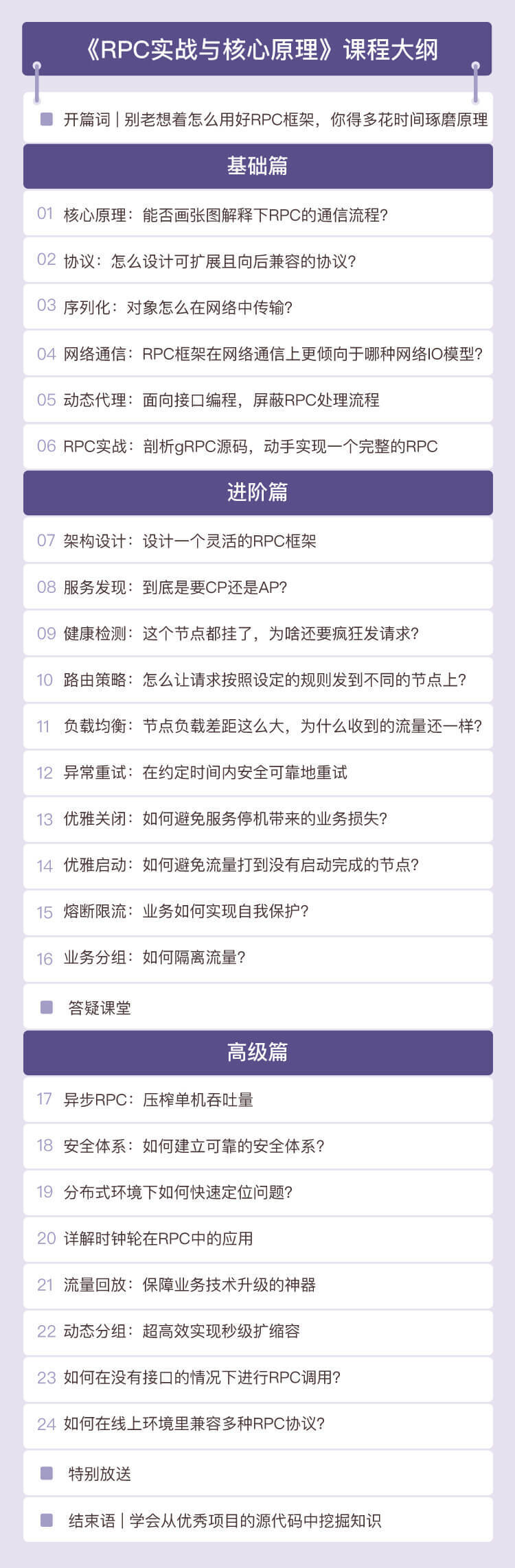 进阶篇:重点讲解RPC框架的架构设计,以及RPC框架集群、治理相关的知识。这部分我会列举很多我在运营RPC框架中遇到的实际问题,以及这些问题的解决方案。