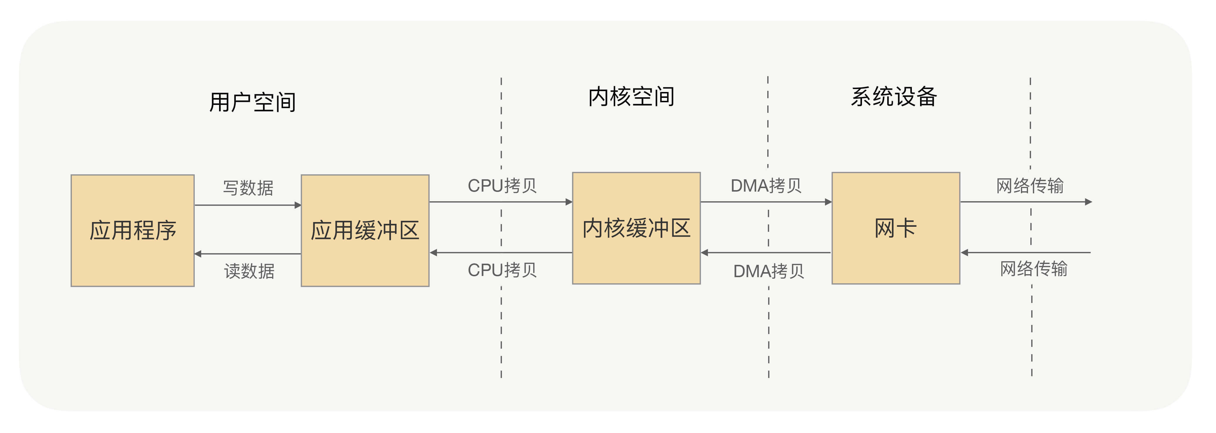 应用进程的每一次写操作,都会把数据写到用户空间的缓冲区中,再由CPU将数据拷贝到系统内核的缓冲区中,之后再由DMA将这份数据拷贝到网卡中,最后由网卡发送出去。这里我们可以看到,一次写操作数据要拷贝两次才能通过网卡发送出去,而用户进程的读操作则是将整个流程反过来,数据同样会拷贝两次才能让应用程序读取到数据。
