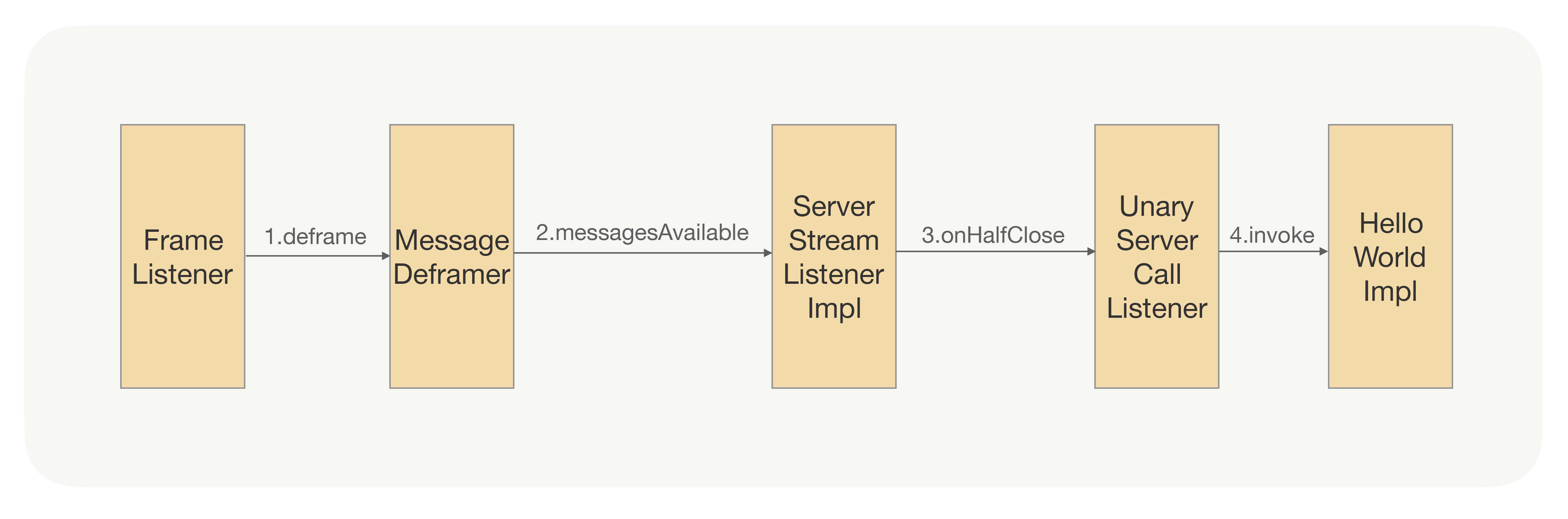 在收到 Header 或者 Body 二进制数据后,NettyServerHandler 上绑定的FrameListener 会把这些二进制数据转到 MessageDeframer 里面,从而实现 gRPC 协议消息的解析 。