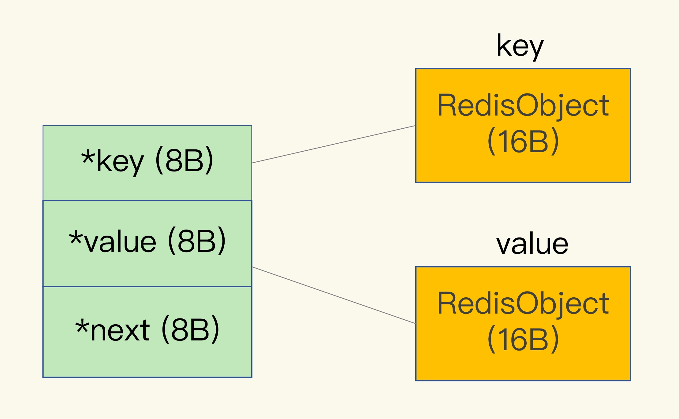 我在【第 2 讲】中说过,Redis 会使用一个全局哈希表保存所有键值对,哈希表的每一项是一个 dictEntry 的结构体,用来指向一个键值对。dictEntry 结构中有三个 8 字节的指针,分别指向 key、value 以及下一个 dictEntry,三个指针共 24 字节,如下图所示: